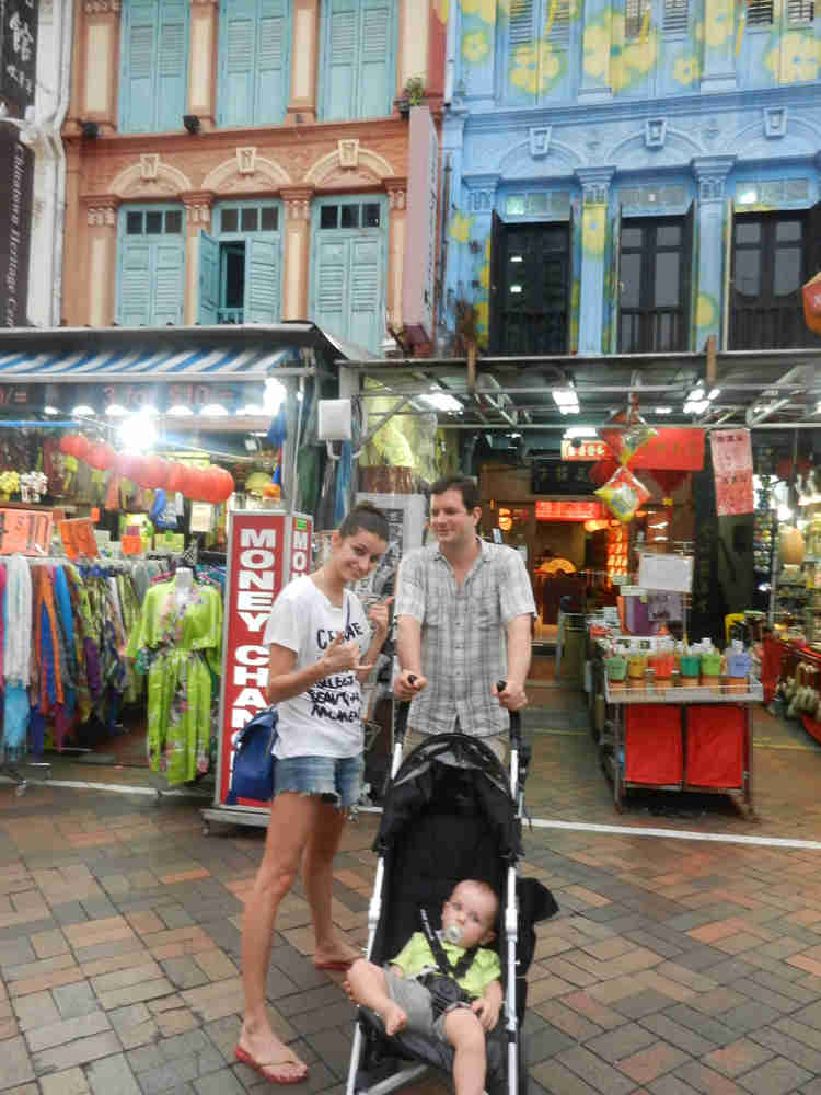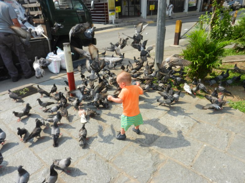 Pour ce premier jour, départ pour Little India et Marina Bay Sands : grand écart entre une partie traditionnelle, colorée et pleine d’odeurs (et de pigeons, bébé est fasciné) et les grattes ciels futuristes remplis de boutique de luxe : Chanel, Vuitton, Burberry. Petit Jo adore ces découvertes, il est plus embêté de passer presque inaperçu ici (les gens sont plus scotchés à leurs téléphones et à leurs tablettes), ça change de la Malaisie où il était partout accueilli avec des « baby, so cute ». Alors il essaie de faire son intéressant en attrapant les habits des gens qui passent à sa portée dans le MRT (leur métro) ou en cavalant dans les allées nickel chrome du métro. Grace à lui on peut s’asseoir sur les sièges réservés.