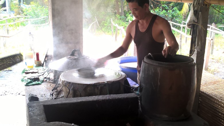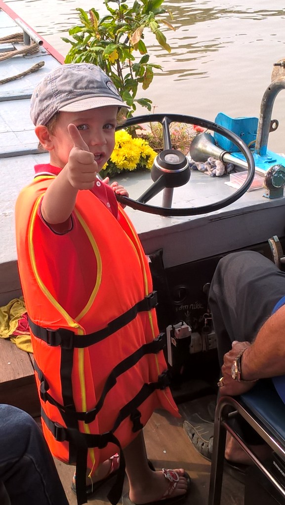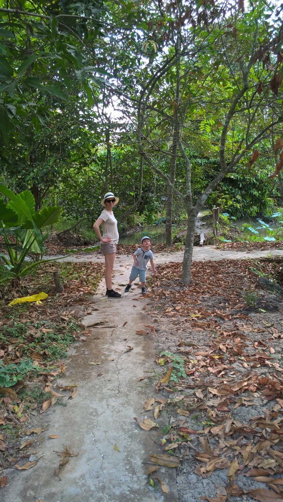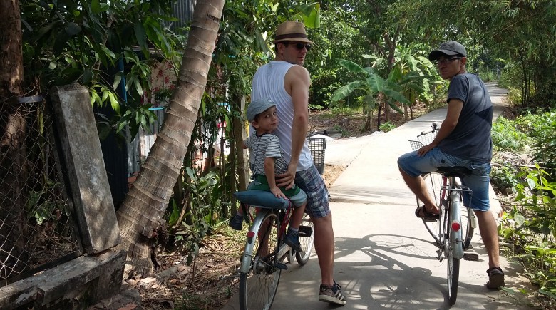 Nous partons à la découverte des villages du Mékong en vélo, un moyen très agréable de se promener, avec un guide charmant qui nous explique un peu la vie quotidienne ici. Ce sera une des rares fois où nous pourrons vraiment parler de la vie dans le pays avec un local, il parle bien anglais (mieux que nous surement) et il est très amical. Malheureusement, cette escapade se termine mal pour le petit aventurier et nous abrégerons la visite en raison d’une blessure au pied très douloureuse.