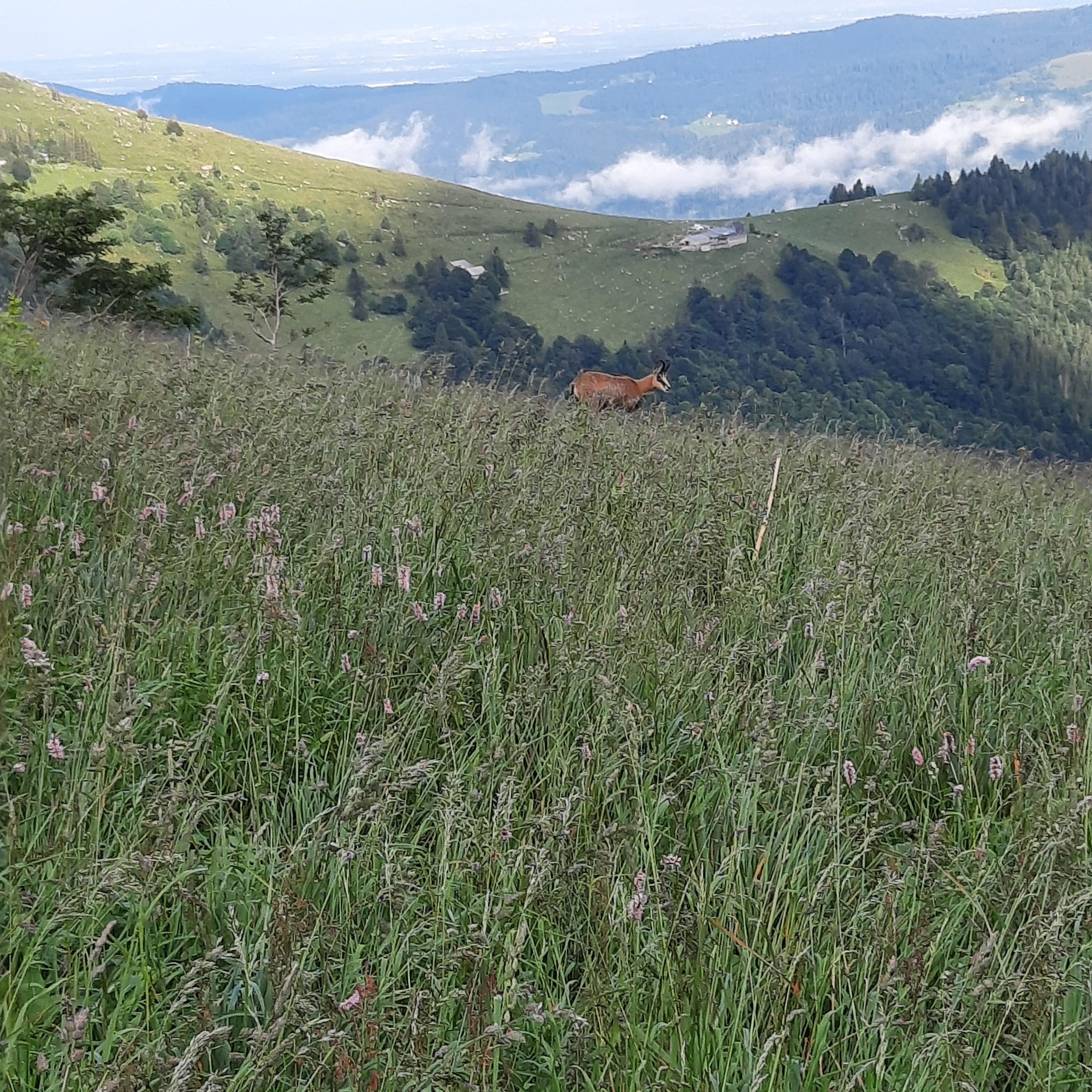 - Le Hohneck : tout un symbole avec ce point culminant du département des Vosges. A 1363m d’altitude l’occasion d’une vue à 360°C sur le massif. Outre la possibilité de monter tout en haut pour se sustenter à l’auberge du sommet, nous avons également eu la grande chance d’y observer des troupeaux de chamois, dans un décor de carte postale. Le départ se fait au parking au bas du sommet et nous avons eu un guide fort sympathique pour nous guider pendant 2h, tout autour du sommet. Pas de difficultés particulières pour cette sortie qui se fait très bien en famille (pour nous des enfants de 4 à 8 ans – mais le petit aventurier l’avait déjà faite plus jeune sans souci) avec beaucoup beaucoup de pauses pour observer.