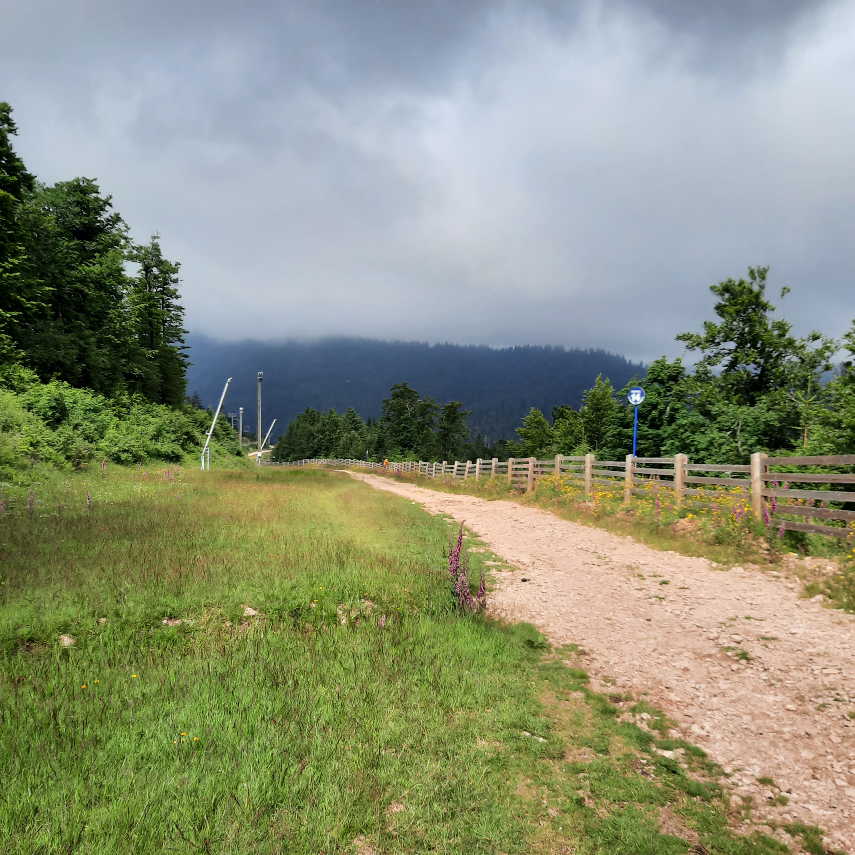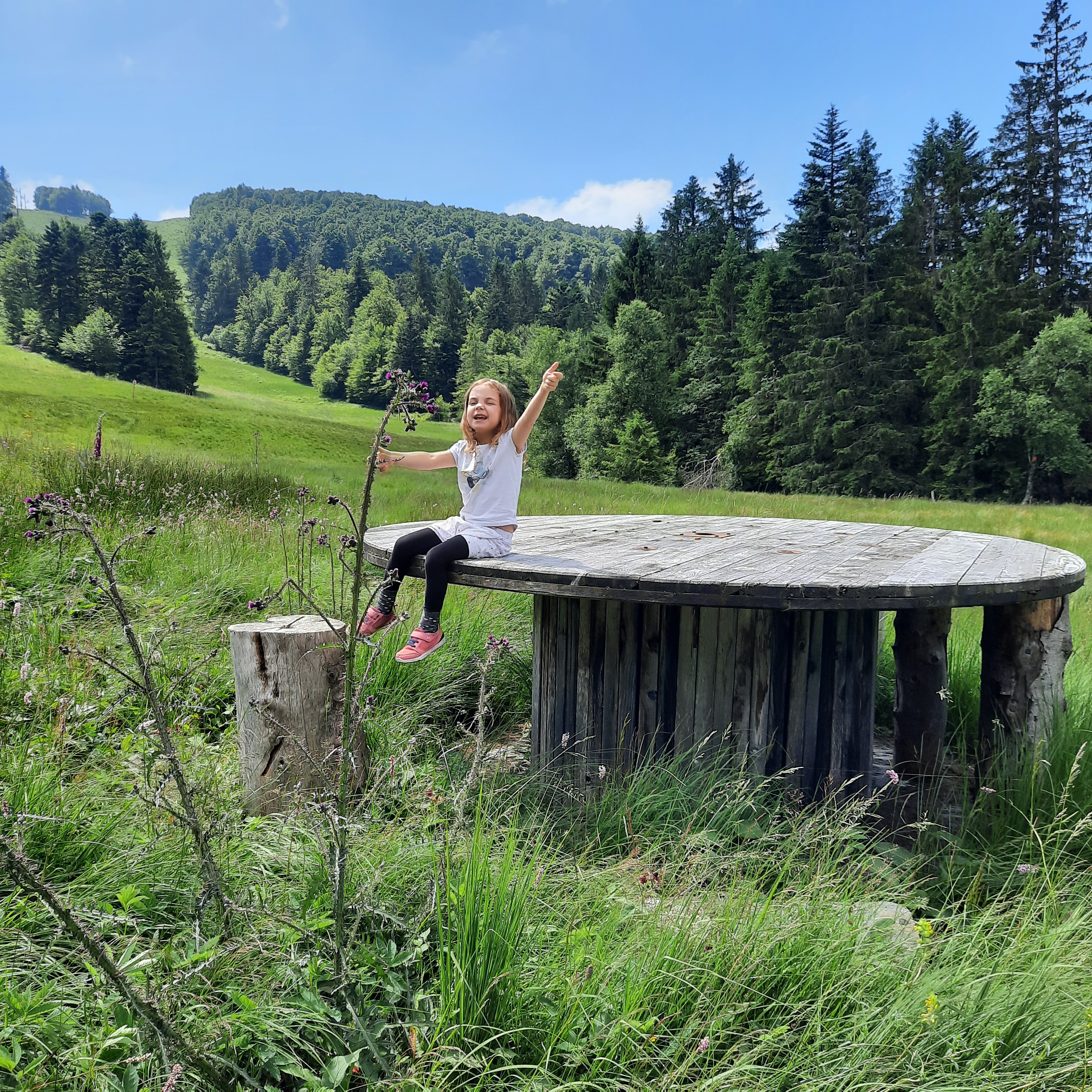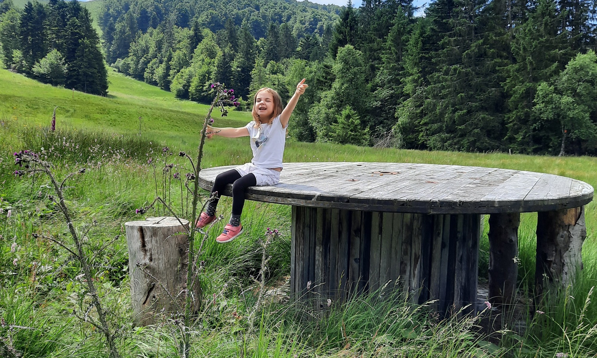- La station de la Bresse-Hohneck : station de ski en hiver et de vtt en été, c’est l’ occasion de faire de la Schlitte et de partir marcher depuis le sommet grâce au télésiège. Quatre promenades sont proposées depuis le haut du télésiège de la Vologne et cela simplifie un peu pour les enfants en leur évitant la montée. C’est plutôt bien balisé et facile à faire pour tous. Nous avons fait la promenade « En passant par Thiaville« , la durée est un peu plus longue que celle indiquée, mais nous sommes allés à notre rythme car il fallait attraper des grenouilles, faire des jolies pauses pour les photos, convaincre Minicette d’avancer…..