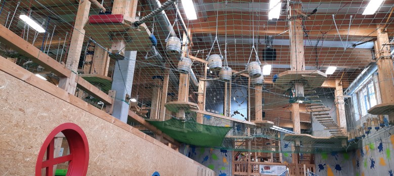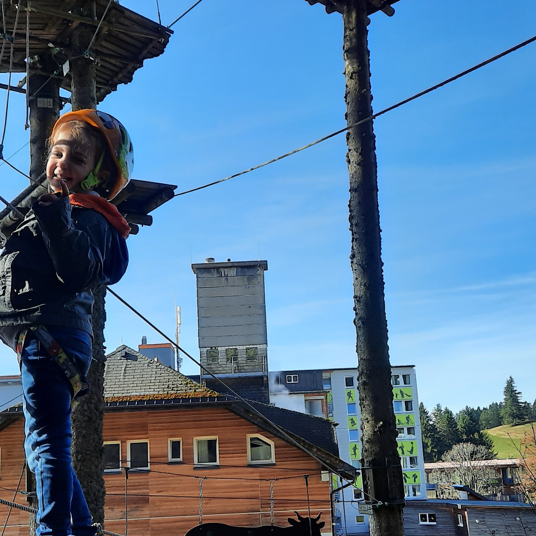 - Accrobranche intérieur, fun parc, escalade et trampoline : l’excellente idée de l’hôtel c’est que comme en montagne les conditions météo ne sont pas toujours optimales : il ne fait toujours beau en été et il n’y a pas toujours de neige en hiver, proposer des activités intérieures variées permet à tous de passer de bonnes vacances. Il y a donc une grande salle, « Fundorena », qui propose tout un tas d’activités. Avec la Hochschwartzwald Karte, l’accès est possible tous les jours pendant une heure. Au vu de l’affluence limitée cette semaine-là, nous avons plutôt passé deux heures chaque jour à escalader (escalade de bloc donc pas de prérequis pour assurer les loulous), sauter sur des supers trampolines adaptés pour les plus petits et les plus grands selon la salle et accrobrancher (?). Le lieu est très aéré, lumineux et les parcours sont variés et très beaux visuellement, tout en bois, avec des thèmes sympathiques pour l’accrobranche (hiver/été à la montagne avec des skis, snowboard et imitations de télésiège à parcourir). C’est ouvert à tous dès 5 ans, pour les plus jeunes l’accès est limité aux trampolines et au fun park mais il y a de quoi passer un très bon moment. Nous avons tous adoré et ce fut particulièrement sportif.