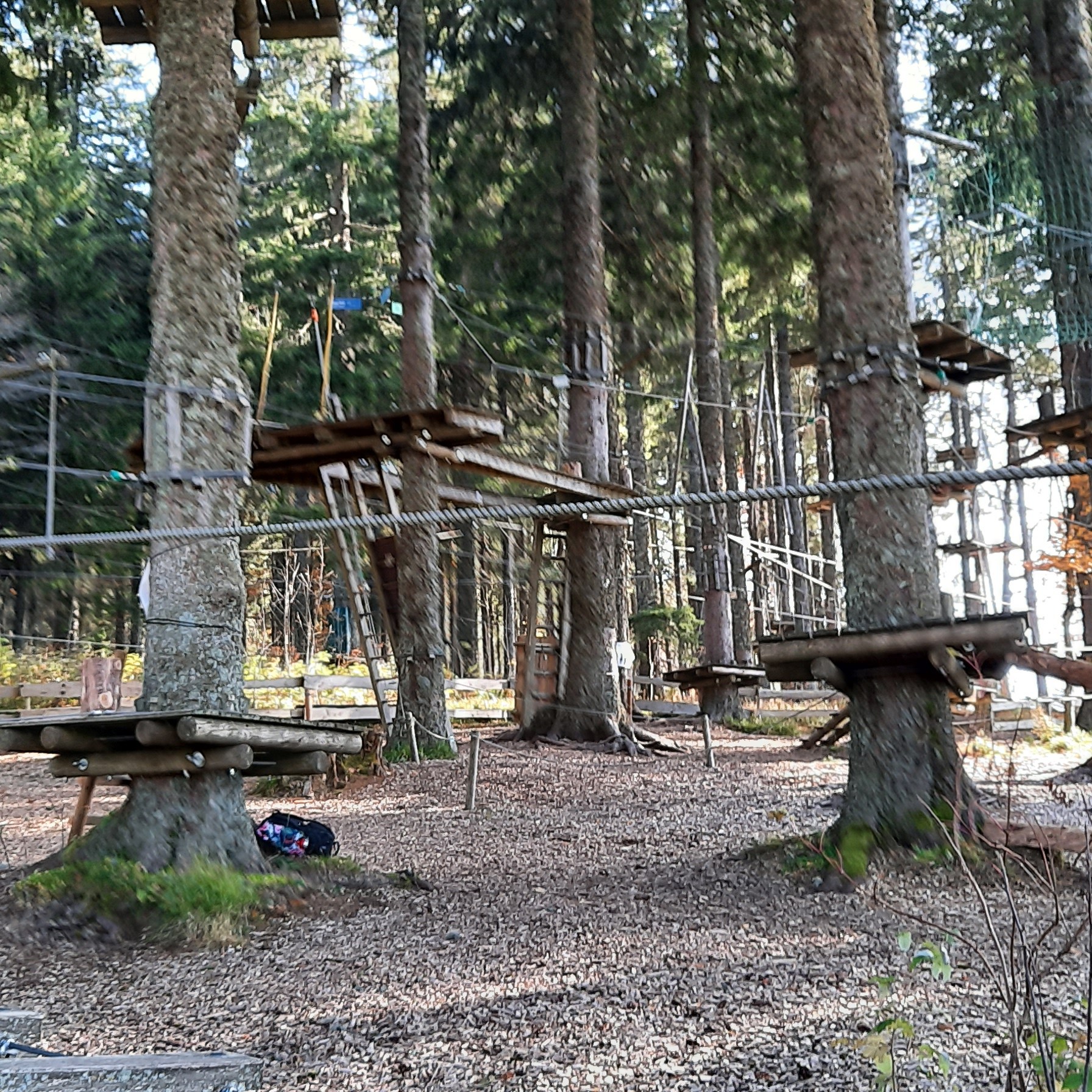 - Activités extérieures : comme il faisait un temps splendide, nous avons pu aussi profiter des belles activités extérieures, car une fois encore il y avait de quoi faire entre l’aire de jeux thème araignée et l’accrobranche « Kletterwald ». En deux heures d’accrobranche : nous avons pratiqué presque tous les parcours car ils sont tous accessibles (on avoue on a passé le noir, ça semblait trop compliqué) ainsi que le parcours de tyrolienne. La vue est magnifique, au loin les Alpes et plus près le Feldberg, de quoi apprécier grandement ce parcours en haut des arbres. Pour les plus jeunes, deux sentiers sont spécifiquement dédiés, plus près du sol et plus faciles. Tout le monde s’y retrouve. Nous avons aussi eu la chance de voir des rapaces lors d’une présentation par un fauconnier du coin. Bon on avoue….on a pas compris grand chose aux explications données mais voir les oiseaux de près était déjà magique, de quoi mettre des paillettes dans les yeux des petits.