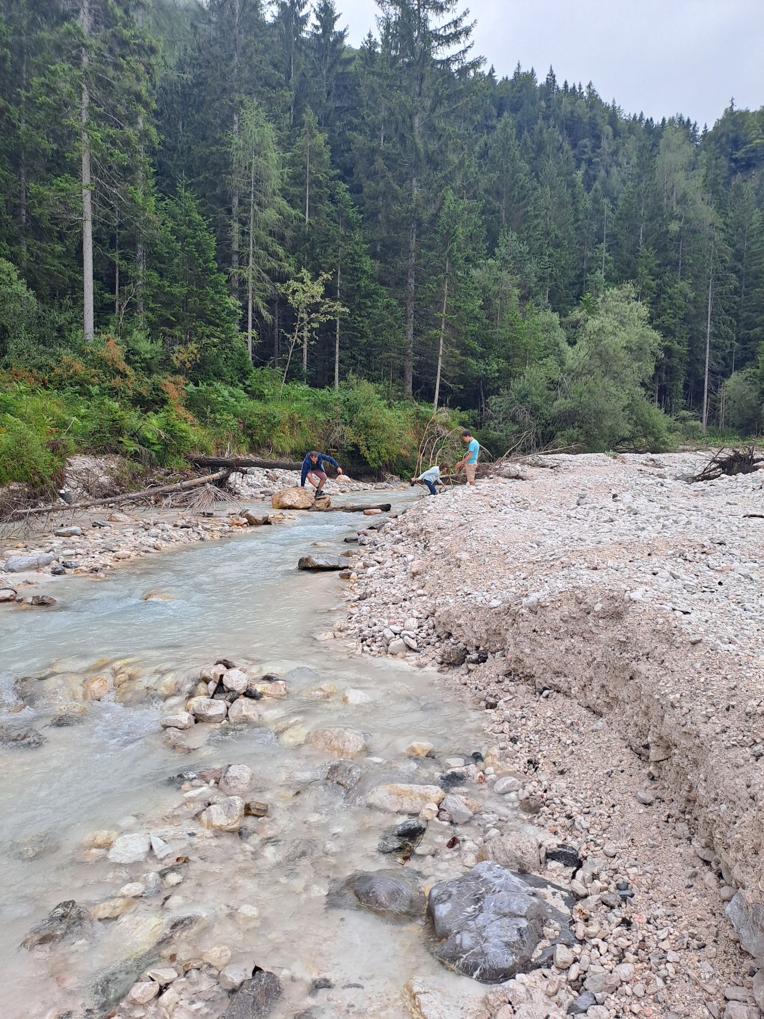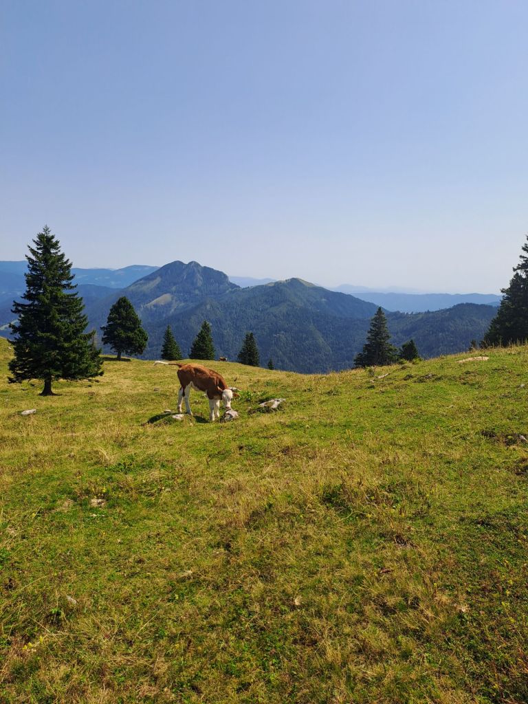Les enfants ont moyennement apprécié mais pour les adultes ce fut une journée magnifique avec vue sur les sommets, le village en bois… le tout sous le soleil et accompagnés de vaches… A la fin de la journée, détour par la rivière, et le défi du jour fut surtout la petite source de la rivière Kamniska bistrica, absolument magnifique et intensément glaciale ;), dans laquelle nous avons néanmoins tenté de nous baigner.