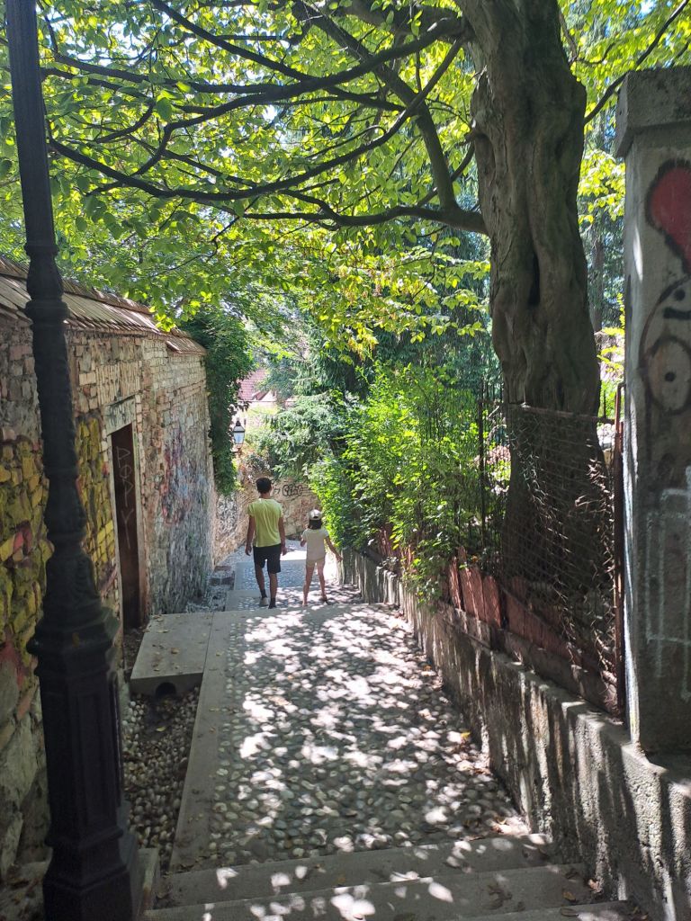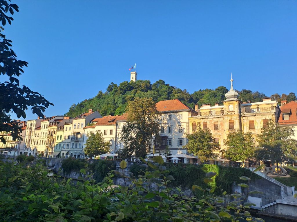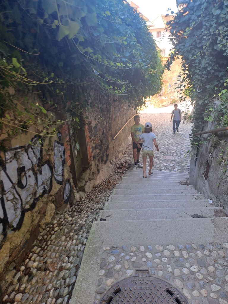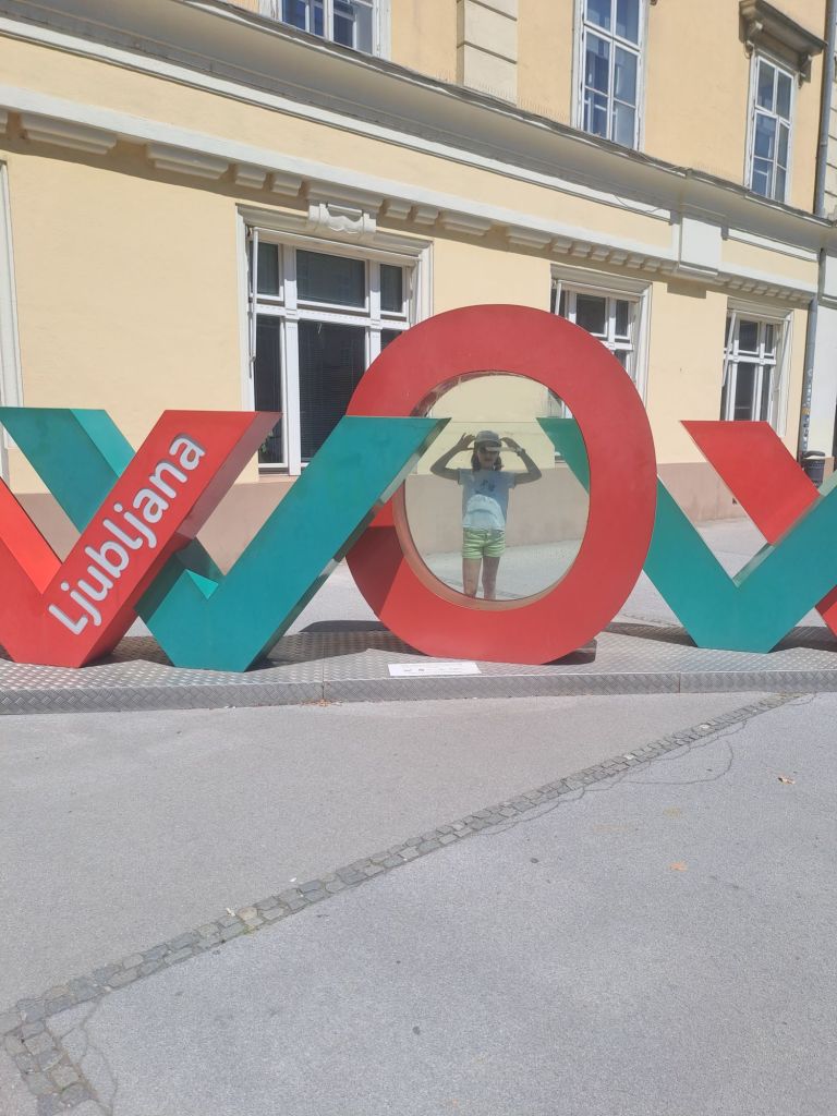 Troisième arrêt : la ville de Ljubljana. C’est là que le petit aventurier a retrouvé le sourire avec le retour à la civilisation, les immeubles et la circulation : c’est son élément. Il a vraiment adoré visiter cette ville, la découverte urbaine c’est vraiment son truc. Pendant deux jours nous avons sillonné la ville et profité de ses charmes. C’est une belle ville qui offre des promenades ombragées le long de l’eau, des bons restaurants, des vues depuis le château et des musées étonnants : nous avons visité le musée de l’informatique et la maison des illusions et ce fut un carton plein les deux fois.